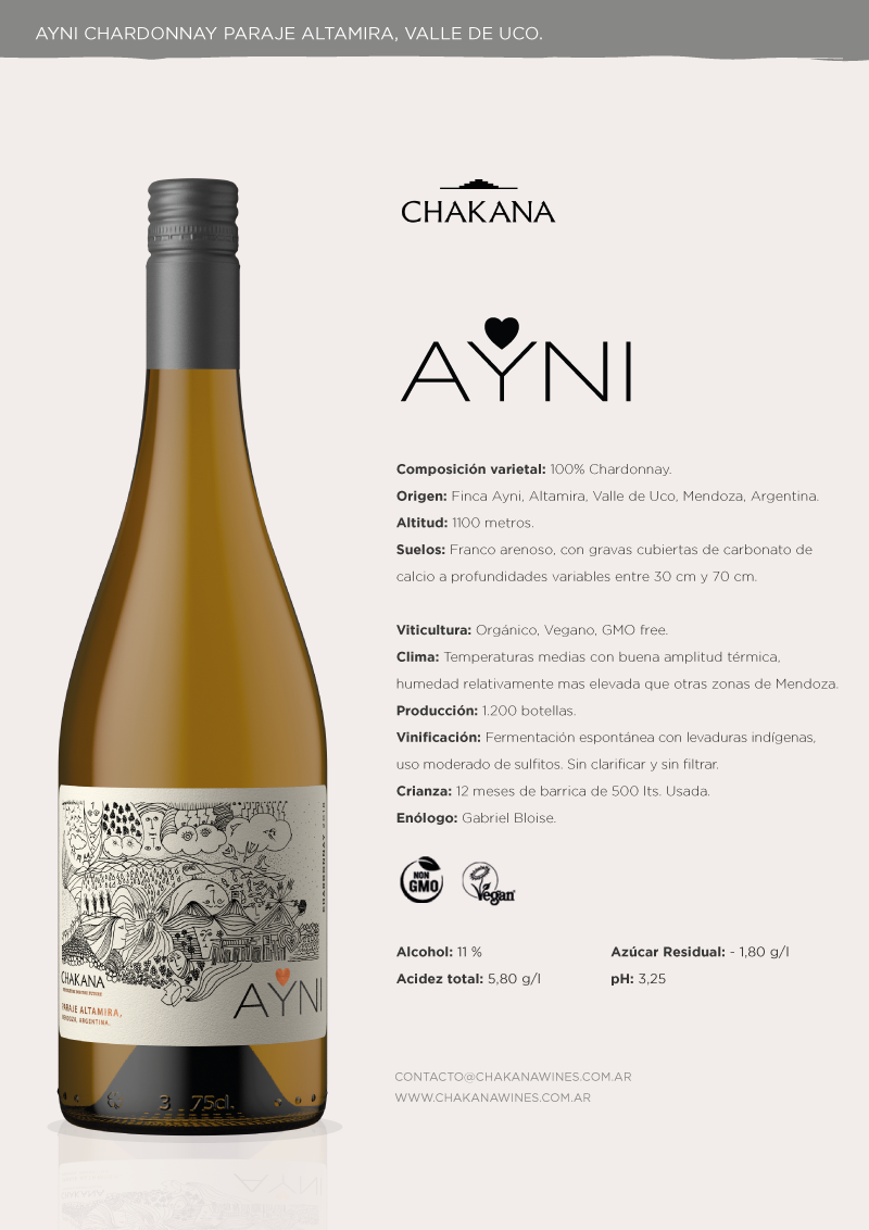 Durante las cálidas mañanas de febrero, cosechamos manualmente y en diferentes momentos las uvas en nuestra Finca Ayni situada en Paraje Altamira, Valle de Uco, Mendoza. Las uvas de este Chardonnay una vez prensadas con racimo entero inician la fermentación espontáneamente gracias a sus levaduras indígenas. Con acidez natural, sin clarificación (Vegano certificado) ni filtrado.