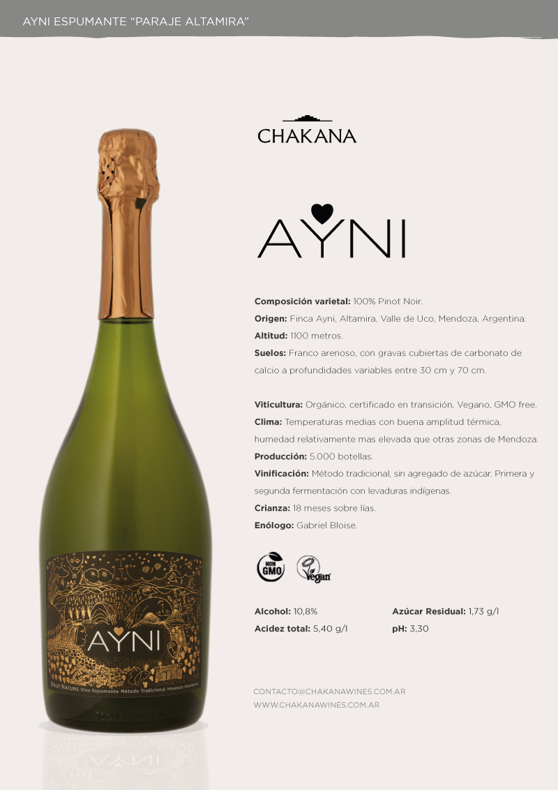 A mediados de febrero, cosechamos manualmente las uvas Pinot Noir provenientes de nuestro Viñedo Ayni en Paraje Altamira, Valle de Uco, Mendoza Agrelo. El vino base inicia la fermentación espontáneamente gracias a sus levaduras indígenas. Luego, y sin completar la fermentación embotellamos este vino base para que acontezca la toma de espuma y posteriormente termine la fermentación y crianza junto a sus lías durante 18 meses dentro de la botella. Nuestro Blanc de Noir de método tradicional champenoise también es vegano. En la copa luce su delicado color rosado tenue y un fino rosario de burbujas. A la nariz llega frutado, floral y con aromas de Panadería. En la boca se siente su fresca acidez, su cremosa efervescencia y su complejidad media alta. De esta forma, Ayni espumante resulta un compañero ideal en aperitivos, comidas ligeras, ricas sobre mesas y el brindis final.